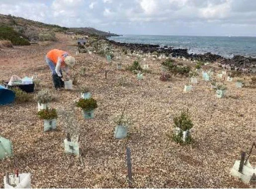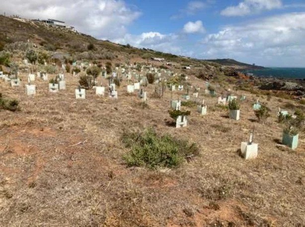 The plantings shown are on the western side of the Heysen Trail/Wild South Coast Way, near the water’s edge. In between the plantings and the water’s edge is a slight drop, down to the rocks. We are planning a path down from the plantings to the rocks, marking it out on previous working bees. We checked it out again, and decided we need help to get it done properly. If anyone has any trail making experience, cutting steps into a slope, hello! We’d welcome your input!! We need to find time to contact the Friends of the Heysen Trail as they have indicated they might be able to help. Another thing for the to do list!